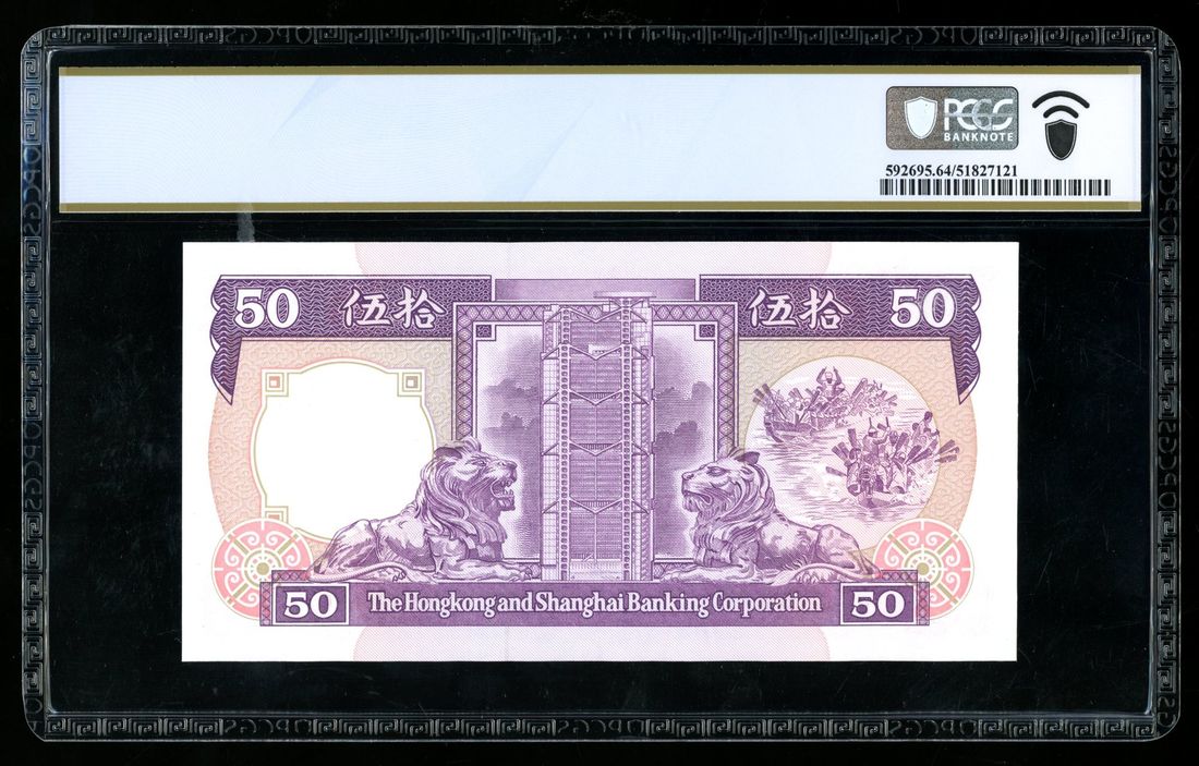 1990年香港上海匯豐銀行伍拾圓,幸運號BL666666,PCGS 64。早期伍拾圓幸運號相當罕見