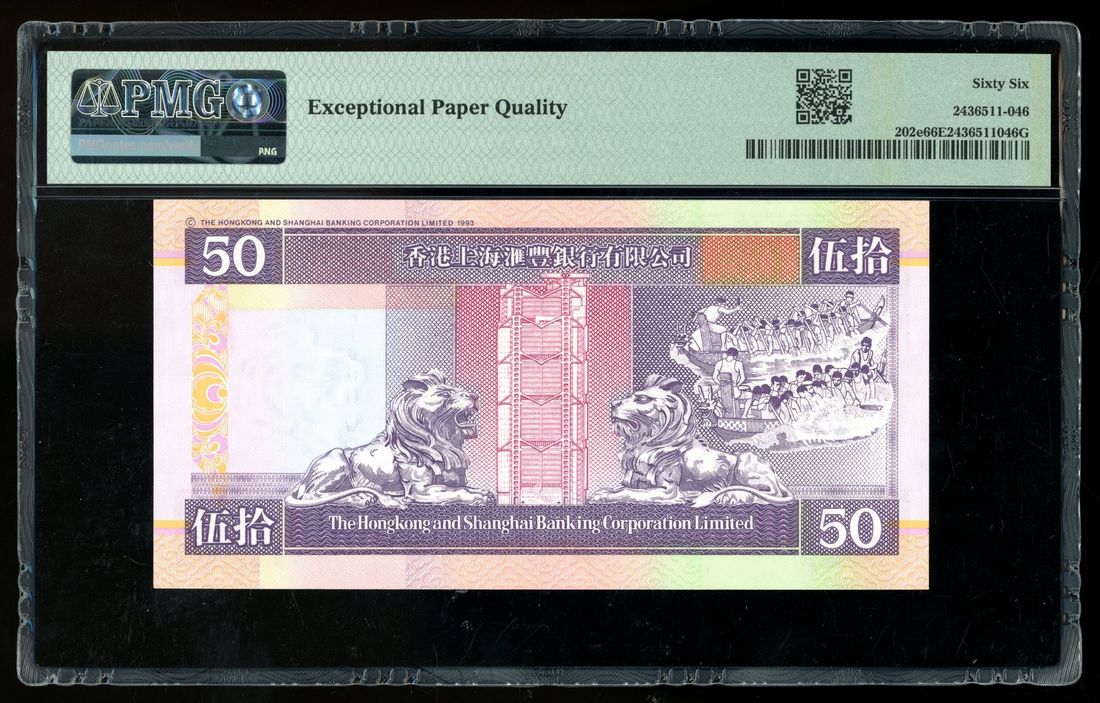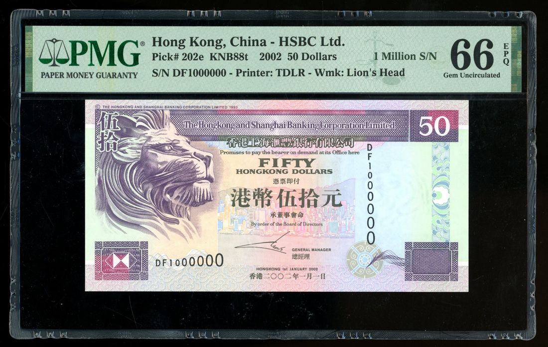 HongKong & Shanghai Banking Corporation, $50, 1.1.2002, 1 million serial number DF1000000, (Pick 202e), PMG 66EPQ