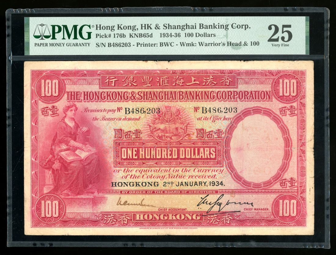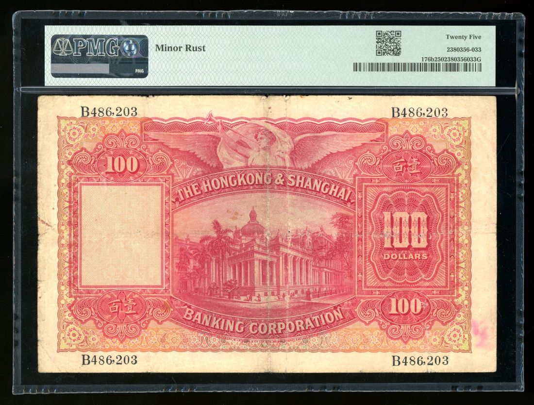 1934年香港上海匯豐銀行壹佰圓,編號B486203,左下手簽署名,PMG 25,有輕微鏽跡。未經修復的原裝品一向令藏家趨之若鶩