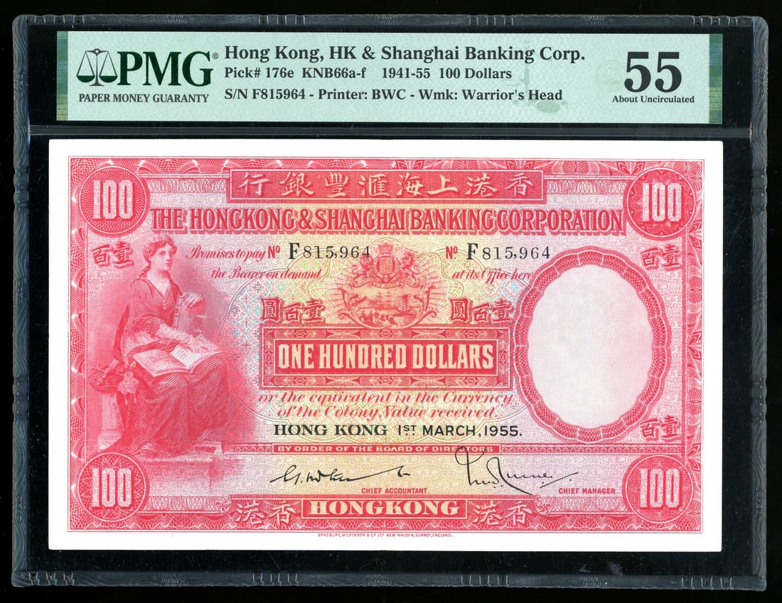 HongKong & Shanghai Banking Corporation, $100, 1.3.1955, serial number F815964, (Pick 176e), PMG 55