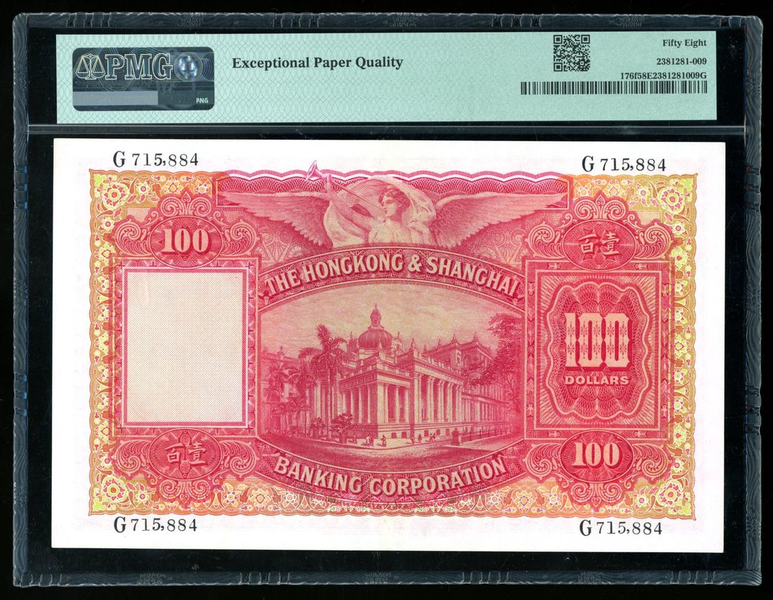 HongKong & Shanghai Banking Corporation, $100, 5.9.1956, serial number G715884, (Pick 176f), PMG 58EPQ