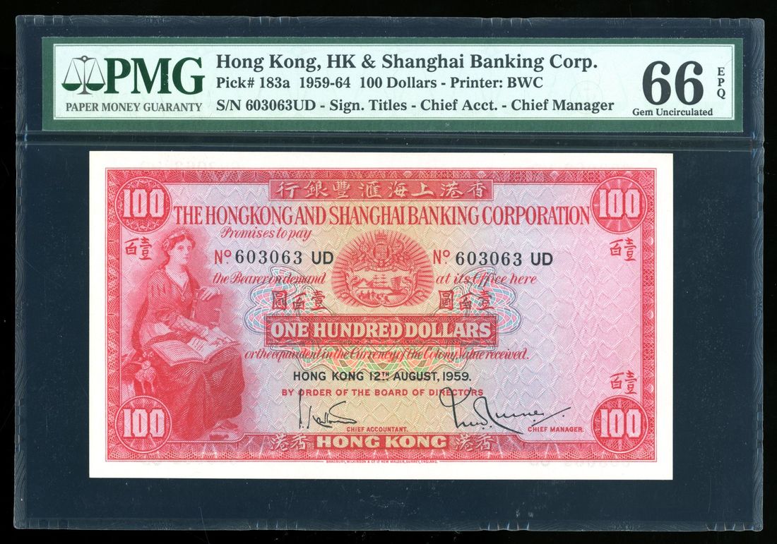 HongKong & Shanghai Banking Corporation, $100, 12.8.1959, serial number 603063UD, (Pick 183a), PMG 66EPQ. First date of the small size $100, one of the top grade avaliable for this year and suffix