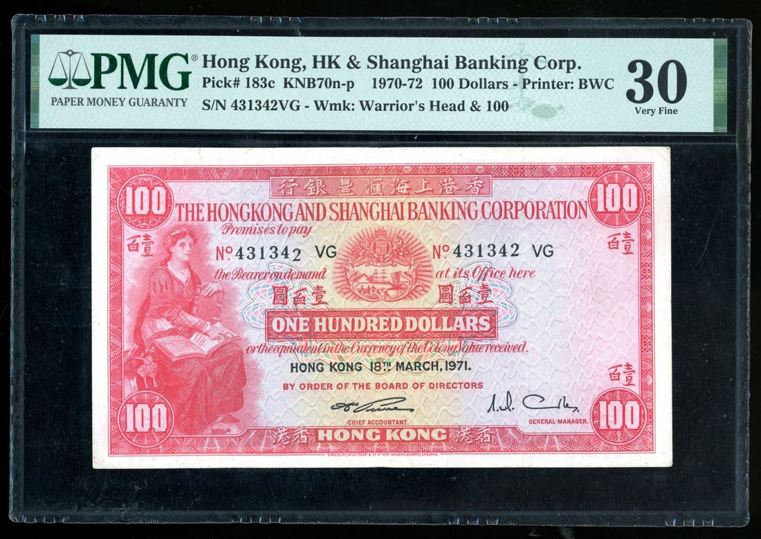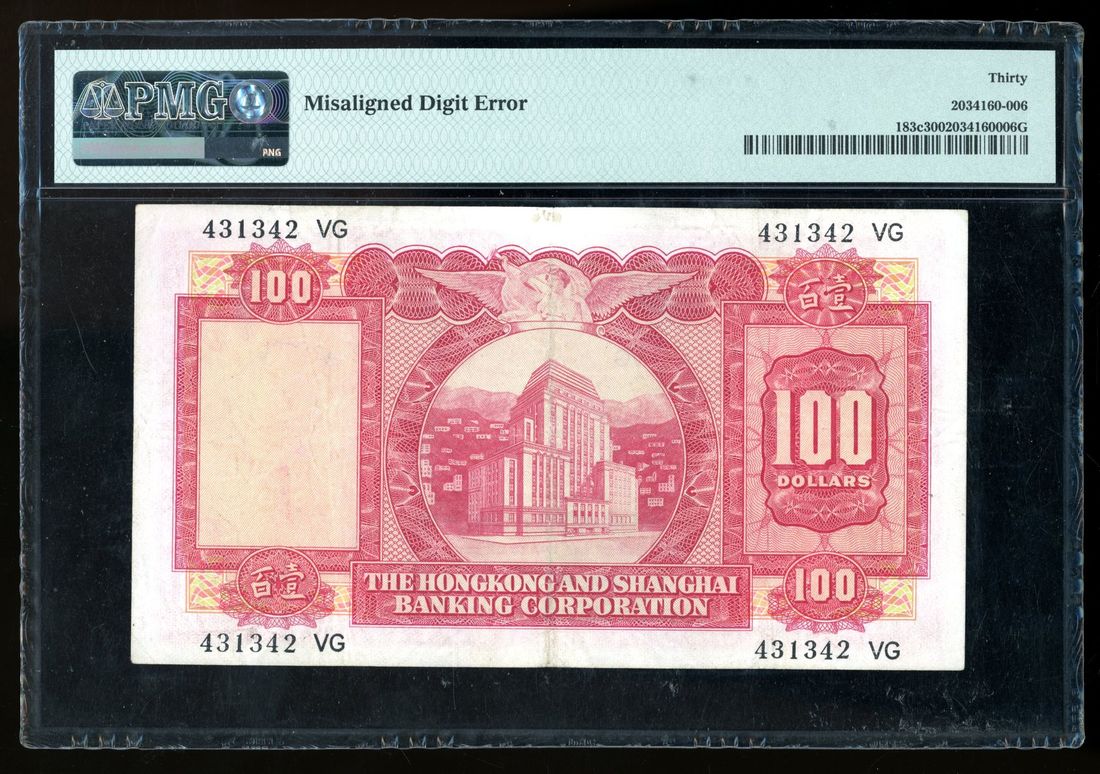 1971年香港上海匯豐銀行壹佰圓錯體票,編號431342VG,跌字錯體,PMG 30。「細聖書」錯體票非常少見