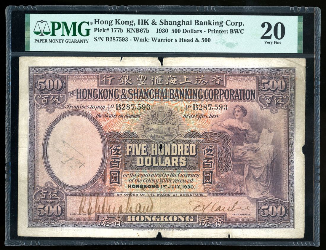 HongKong & Shanghai Banking Corporation, $500, 1.7.1930, serial number B287593, two handsigned signatures,
