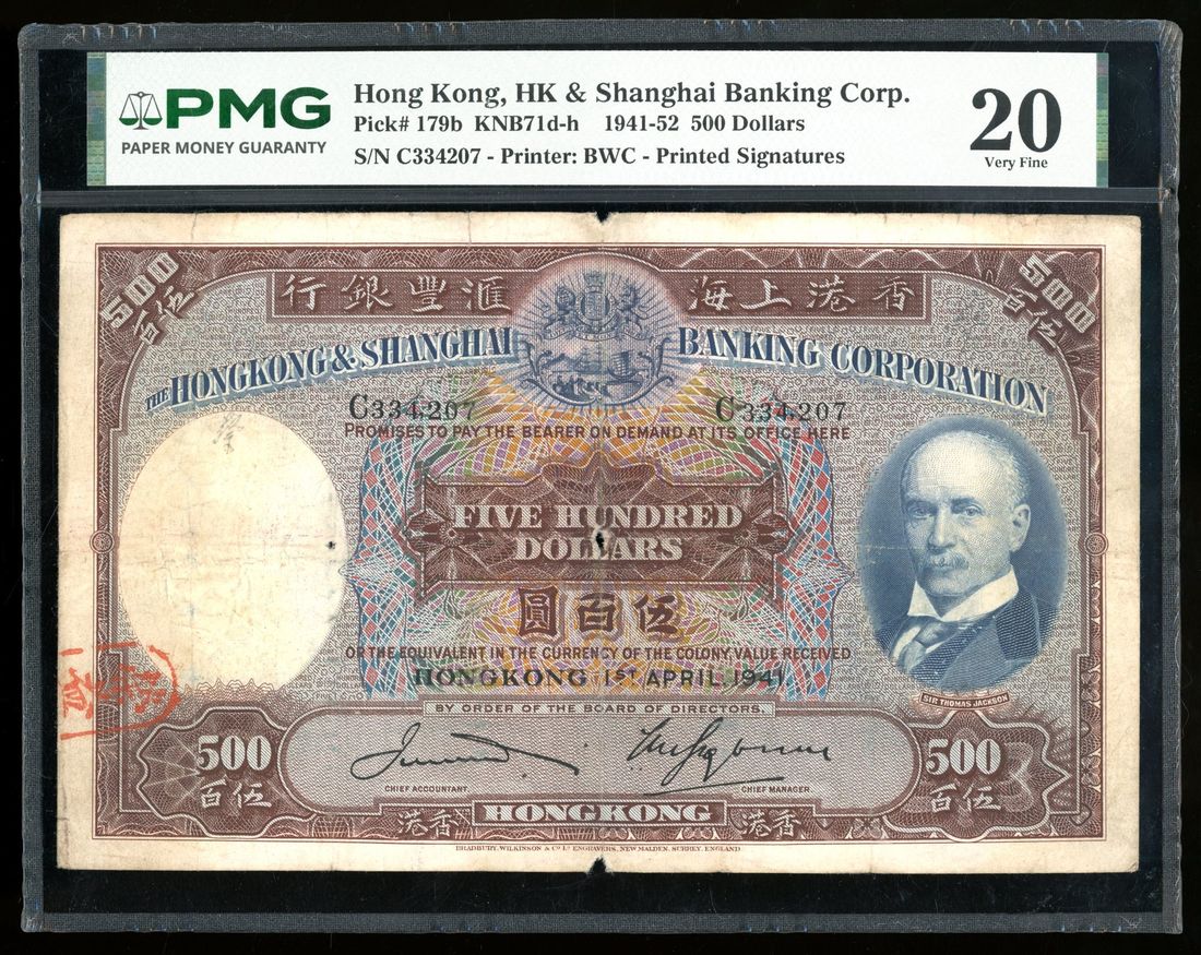 HongKong & Shanghai Banking Corporation, $500, 1.4.1941, serial number C334207, (Pick 179b), PMG 20, splits, ink. First of the printed signature dates with a print run of only 100,000. Rare in any grade