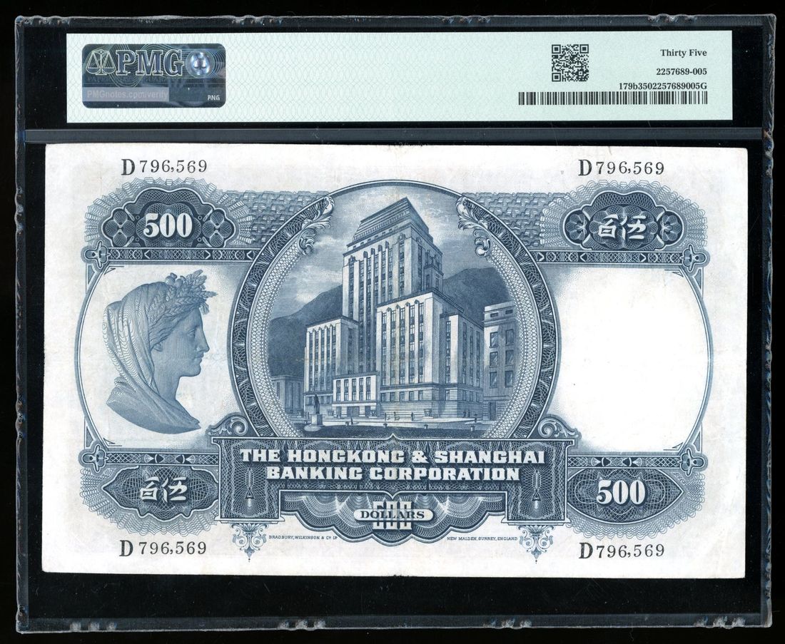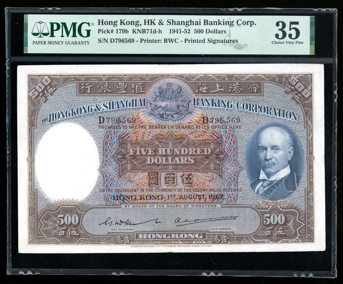 HongKong & Shanghai Banking Corporation, $500, 1.8.1952, serial number D796569, (Pick 179b), PMG 35. An earlier date type
