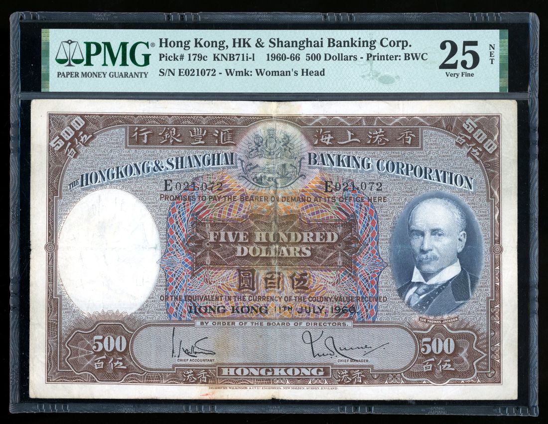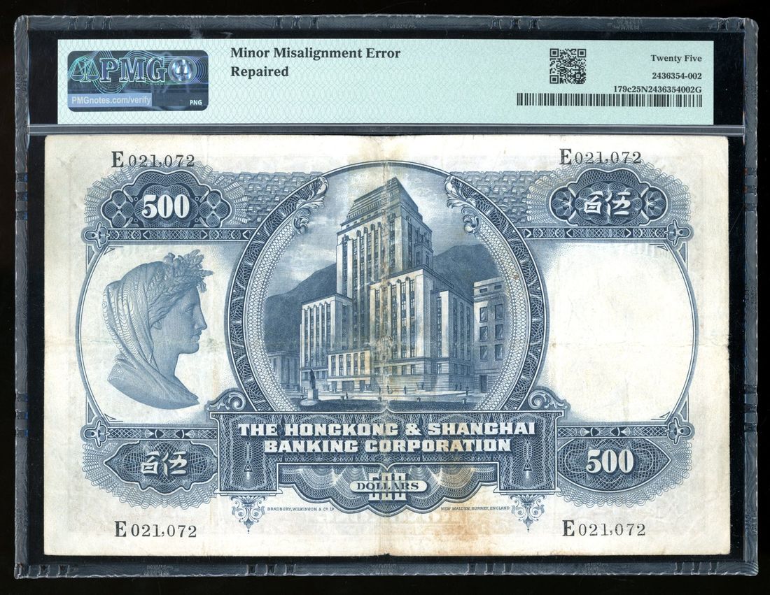 1966年香港上海匯豐銀行伍佰圓錯體票,編號E021072,輕度印刷錯位,PMG 25NET,有修補。 集關鍵版式及大面額錯體票於一身!