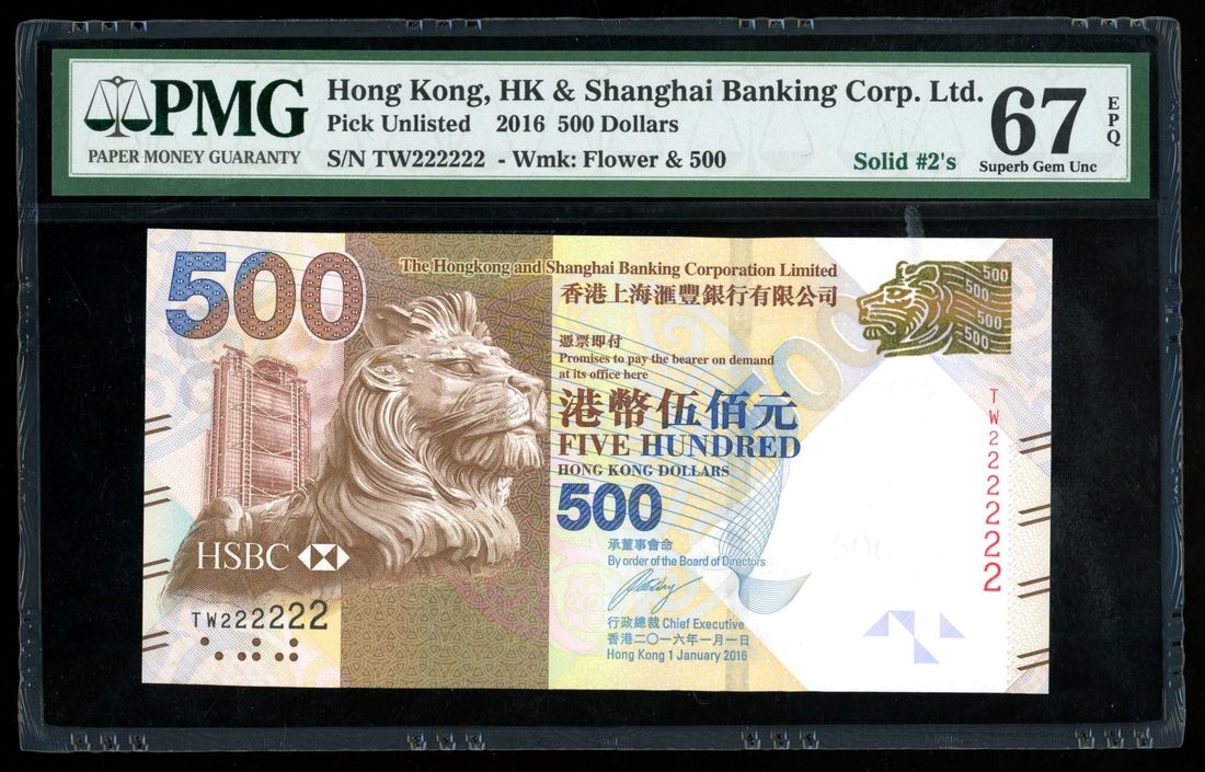 2016年香港上海匯豐銀行伍佰元,幸運號TW222222,PMG 67EPQ