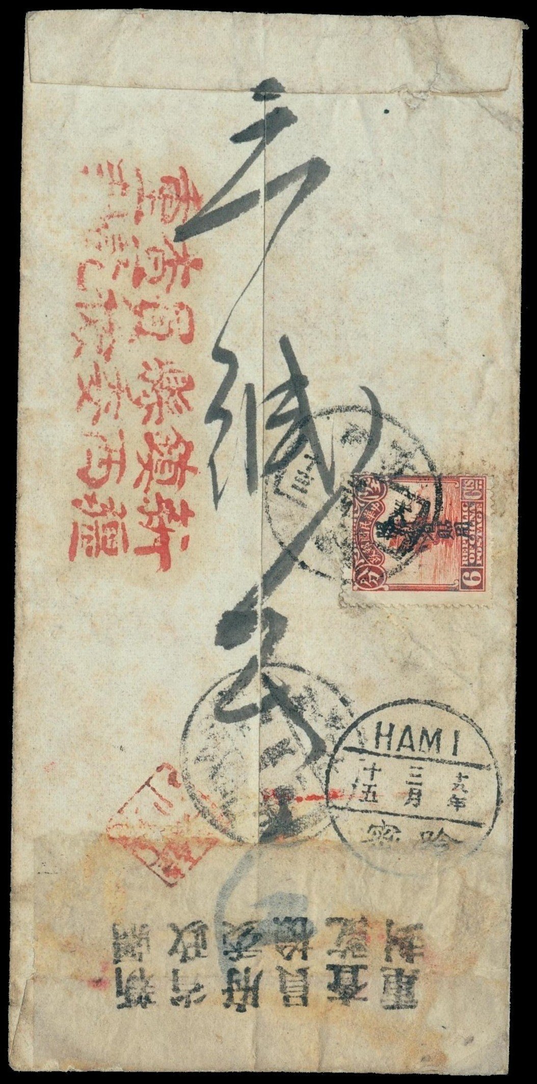 1929 (13 Mar.) red band envelope to Tihwa (21.3) via Hami (15.3) bearing on reverse Sinkiang overprint on Junk 6c. single, cancelled by "Chinsi" c.d.s., showing "Censored" h.s. in red adjacent, fine. Photo