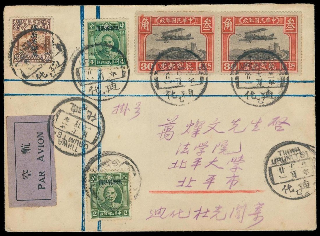 1932 (21 Dec.) first return flight Tihwa-Peiping envelope bearing Air 30c. pair, Sinkiang overprint on Junk 13c. and on Dr. Sun Yat-sen 2c. and 4c., cancelled by "Tihwa/(Urumtsi)" c.d.s., with registration and censor labels, as well as arrival c.d.s. on reverse, paying 79c. postage (9c. surface mail + 10c. registration fee + 60c. quadruple rate airmail fee). Photo
