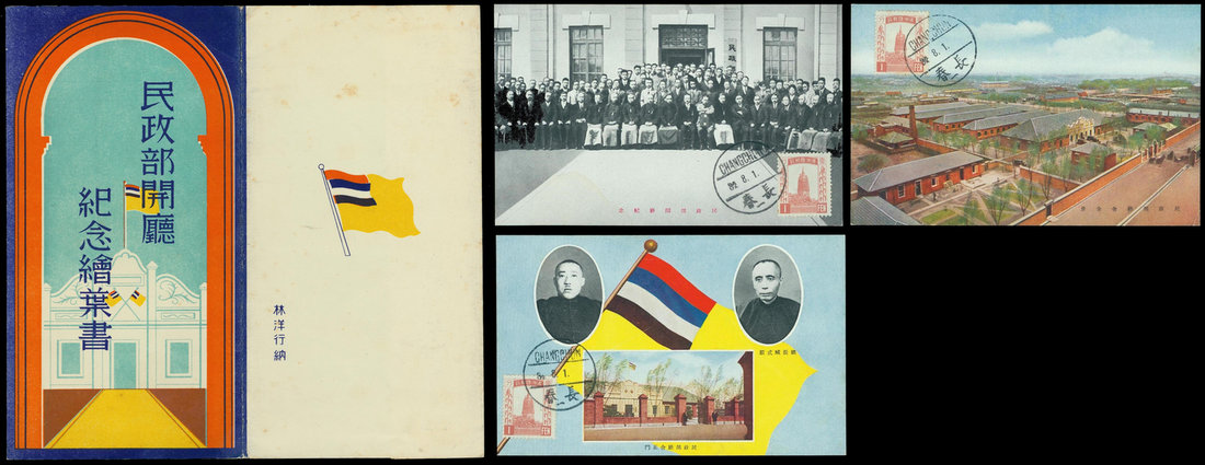 1932 (1 Aug.) the unissued "Commemorating the Grand Opening of the Ministry of Home Affairs" picture postcards (3), including the original pack, each bearing Regular 1f. and cancelled by "Changchun" bilingual c.d.s., unusual. Photo