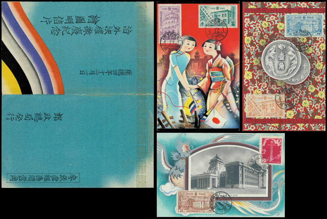 1937 (1 Dec.) "Abolition of Extrality Rights" set of six on picture postcards (3), including the original pack, each cancelled by "Kirin" c.d.s., very fine. Photo