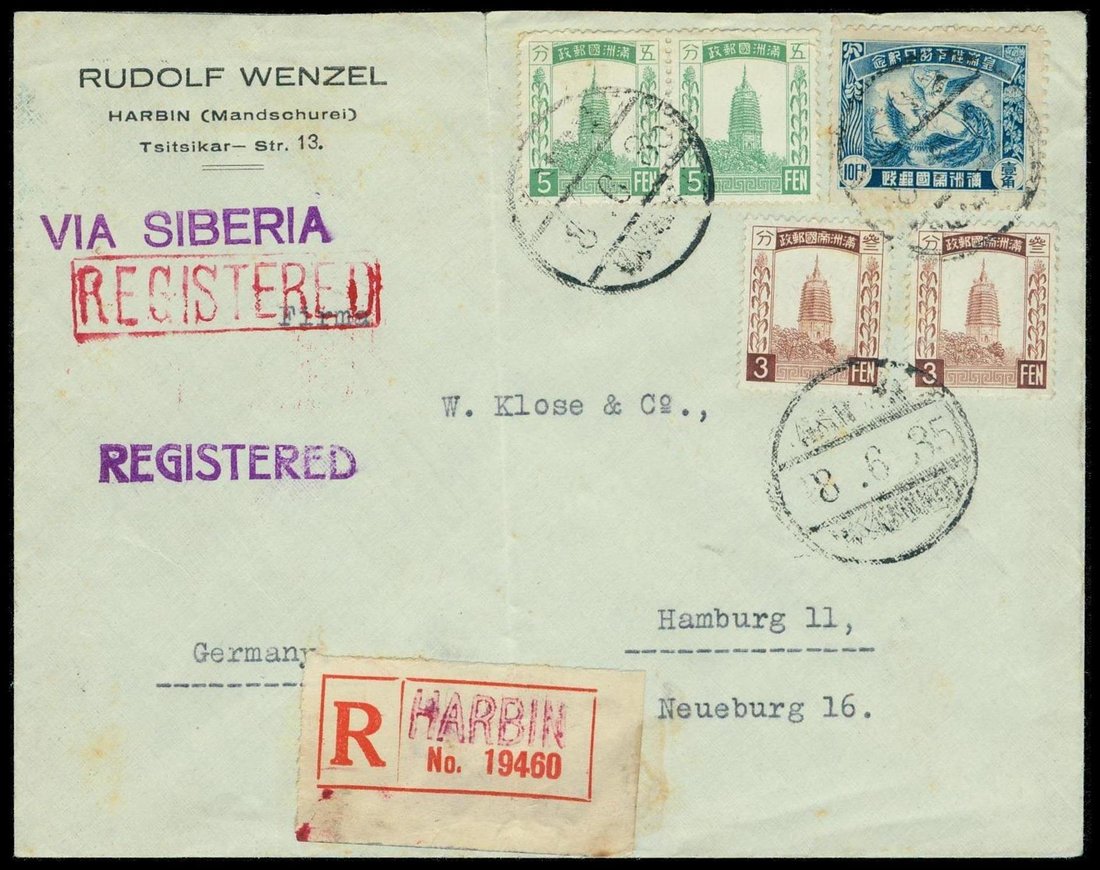 (x) 1935 (8 June) registered envelope to Hamburg (22.6) bearing a total franking of 26f. including First Visit to Japan 10f., cancelled by "Harbin" c.d.s. Photo