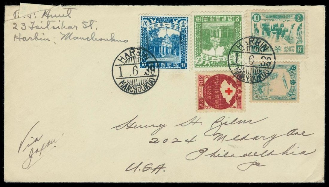 1939 (1 Jun.) envelope (with original enclosure) to U.S.A., endorsed "Via Japan", bearing 1st Anniv. of Founding of Manchukuo 2f. and 10f., 5th Anniv. 3f., Commemorating the Founding of Red Cross Society 2f. and Airmail 1st issue 18f., cancelled by "Harbin/Manchoukuo" c.d.s., a nice cover. Photo