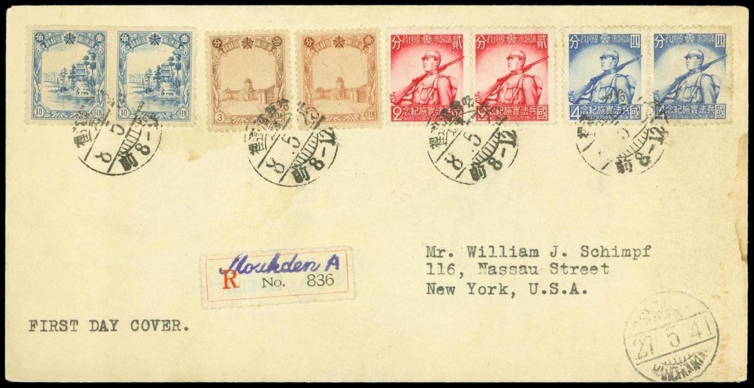 1941 (25 May) registered first-day envelope from Harbin to New York (17.6) via San Feancisco (13.6) bearing Enactment of Conscription Law set of two in pairs and regular issue 1f, 3f and 10f. pair, cancelled by segmented c.d.s., underneath 'Moukden A" registration label. Photo