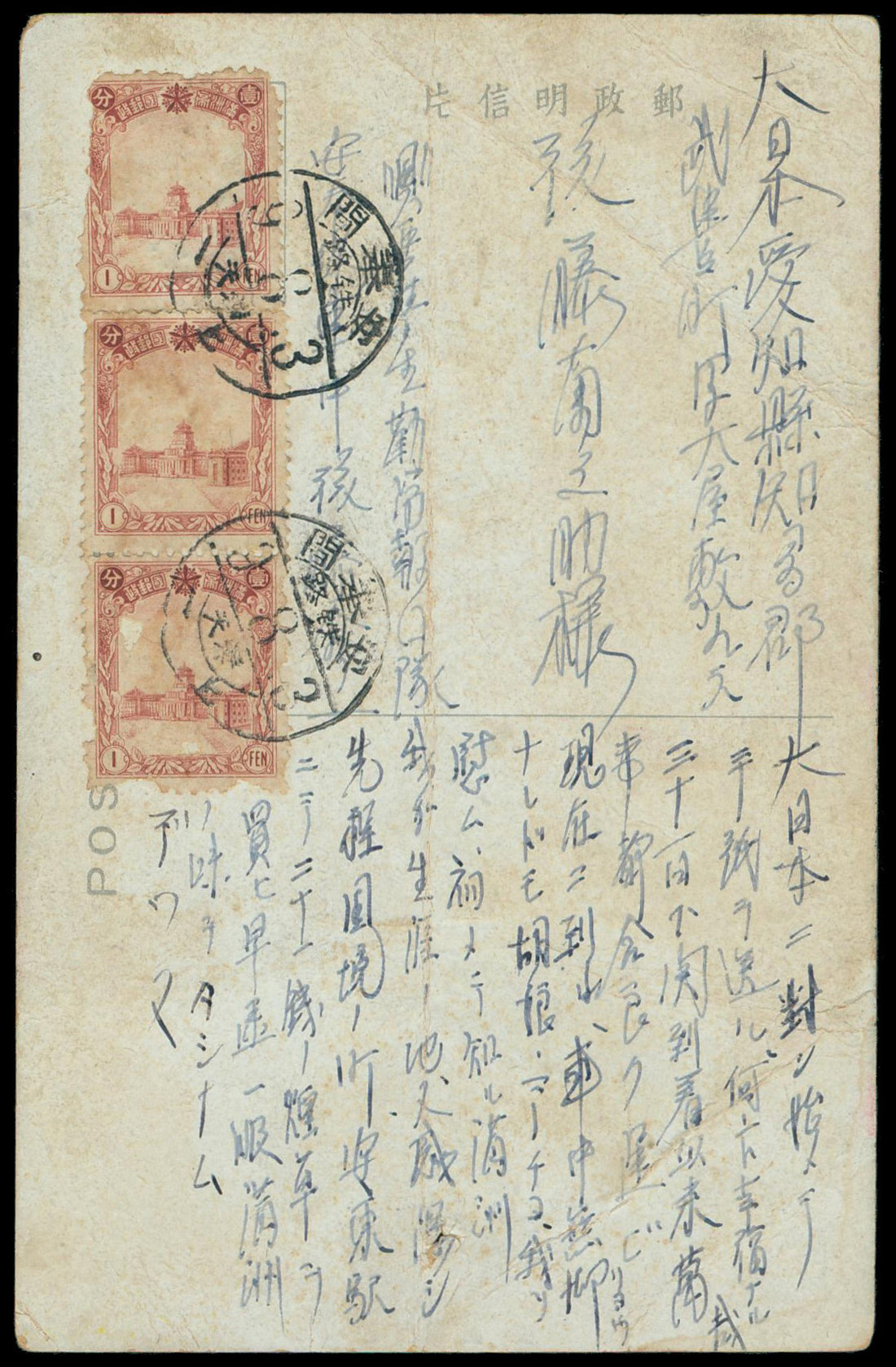 (x) 1942 (3 Aug.) picture postcard to Japan bearing Regular 1f. (3), cancelled by "Antung-Moukden" T.P.O. c.d.s. Photo