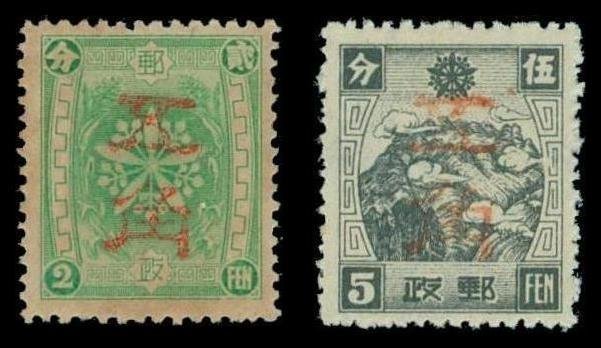 Ping Shan , "An Tung" Province: rubber chop handsurchanged in vermilion 50f. on 2f. and 50f. on 5f.(2), fine unused. Chan MOAD.19D.1-2. Photo
