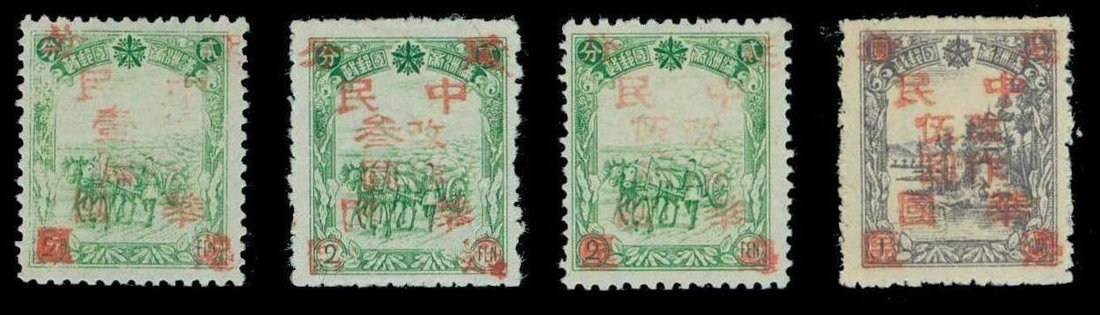 Yen Ji : 1946 4runner chop, hand surcharge in red on Manchukuo stamps, 50f. on 2f., 1Y. on 2f., 3Y. on 2f. and 5Y. on 1Y., very fine and fresh unmounted mint. Chan MOSJ.35A. 1, 3, 6, 7. Photo