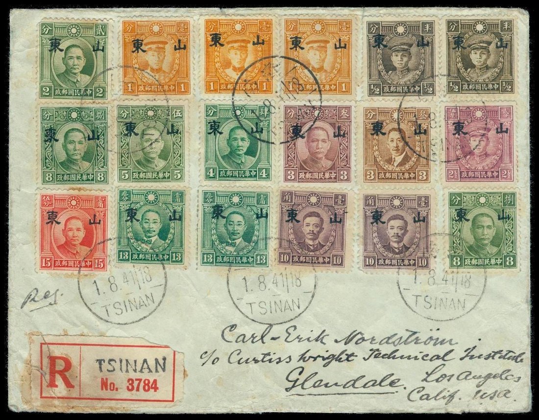 1941 (1 Aug.) registered envelope from Tsinan to California (31.8) bearing "Shantung" overprints on Dr. SYS and Martyrs issues (19), cancelled by native c.d.s., a colourful item. Photo