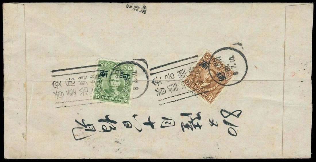 1941 (7 Aug.) envelope from Kaifeng to Tientsin bearing on reverse "Honan" overprints on Dr. SYS and Martyrs 3c. and 5c., cancelled by native c.d.s. and unframed propaganda slogan h.s.; arrival c.d.s on front. Photo