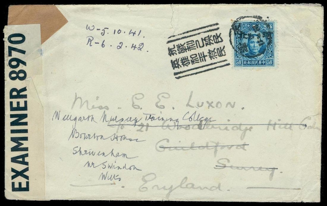 1941 censored envelope to Surrey, England (5.2.1942) bearing "Hopei" overprint on Dr. SYS 50c., cancelled by "tientsin" c.d.s., showing unframed propaganda h.s. in black alongside. Photo
