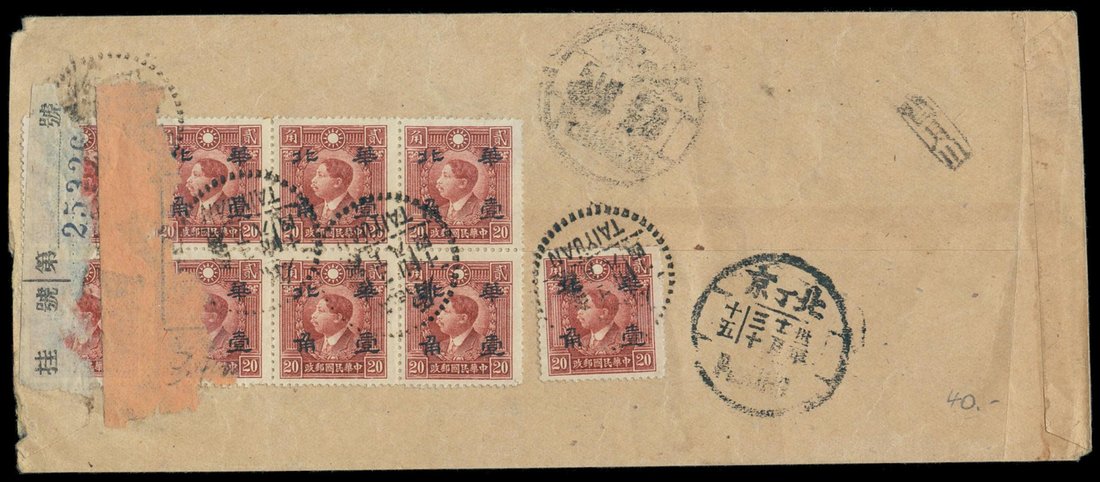 1943 (28 Dec.) envelope double registered to Peking (30.12), bearing on reverse North China Half Value surcharges 10c. on 20c. Martyr single and block of eight, tied by "Taiyuan" c.d.s., fine. Photo