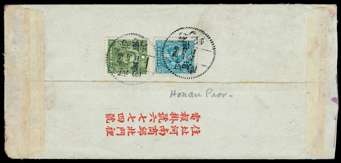 (x) 1941 (5 Jul.) express registered envelope to Tientsin (7.7), bearing on reverse overprinted "Honan" in small characters on Dr. Sun Chung Hwa print 8c. and Martyrs Hong Kong print 20c., cancelled by "Honan/Shangqiu" dotted rim d.s., in all probability the earliest date the issue was used commercially. Photo