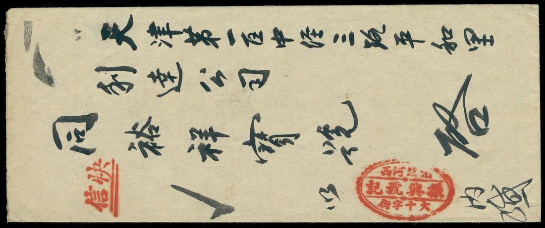 1945 (8 Aug.) express envelope from Potowchen to Tientsin bearing on reverse Commemorating 5th Anniv. of North China Political Council $5 block of eight with trace of express label attached. Chan JN701. Photo