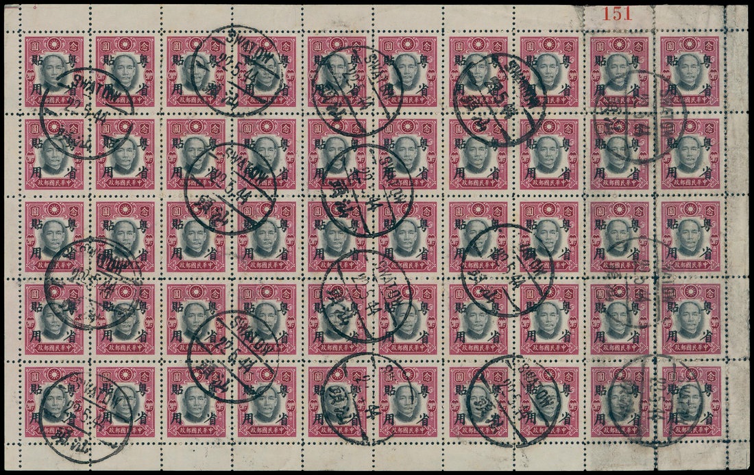 1942 "For Use in Kwangtung Province" overprint on Dr. Sun Yat-sen New York print $20 black and deep violet, in complete sheet of fifty (10x5), a few split and reinforced perf., fine cancelled by "Swatow" bilingual c.d.s. Chan JK55. Photo