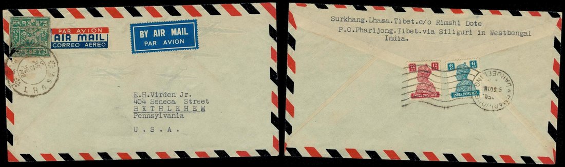1950 (c.) three Lhasa covers with air mail envelope to U.S.A. bearing 4t. emerald-green and on reverse, India 6a. and 12a. tied by Darjeeling maching postmark; internal cover bearing on the reverse ½t. orange [12] with corner and large margins with 2/3t. dark blue (margins in places) with purple handstamp on the address side; internal envelope bearing on reverse, 4t. bright yellow-green [1] with black wax seals. Photo