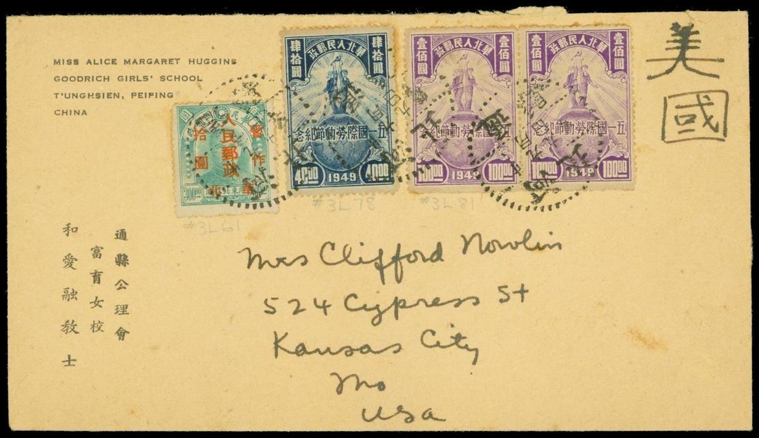 1949 (9 Sept.) envelope to U.S.A., franked with Peking surcharged on SYS $10 on $300 apple blue green, International Labour Day $40 deep blue single and $100 violet in pair, tied by "Hopeh/Tunghsien" dotted rim d.s. Photo.