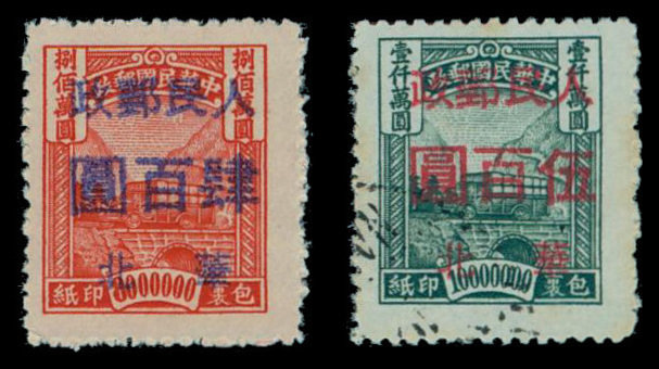 1949 (June) Peking surcharge on Parcel Post stamps with highway design $400 on $8,000,000 (unused) and 500 on $10,000,000(used). Yang NCP2-NCP3. Photo