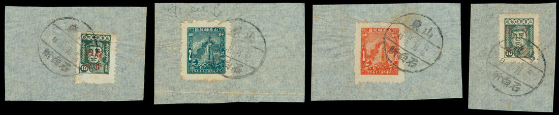 1948 (27 Feb.) pieces (4) bearing "Temporarily Used For" surch. in red on Chu Teh War Time Post $3on 10c. and $10 on 10c.; and Ciaotung Martyrs Monument $1 and $2, cancelled by "Shantung/ Shihkiuso" c.d.s. Yang EC72, EC73, EC85, EC86. Photo