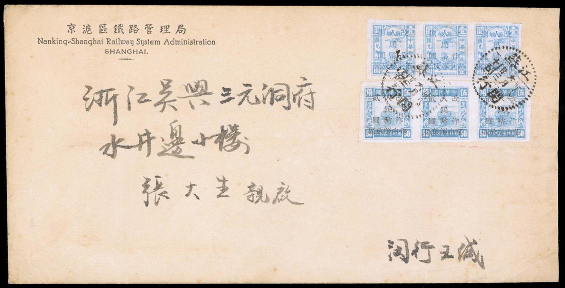1949 (23 Jun.) envelope to Zhejiang bearing Su-Nan surch. on Su-Wan Train $2 on 50c. (3) and on Money-Order $8 on $1 (3), cancelled by "Jiangsu/Minhang" dotted rim d.s. Chan EC352, EC354. Photo