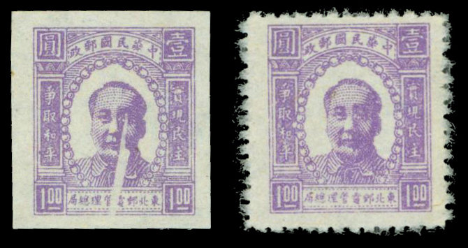 1946 Chairman Mao 1st print $1 rose violet perf. and imperf. singles, the imperf. sngle with pre-printing paper fold variety, unused without gum as issued. Yang NE1, NE5var. Photo