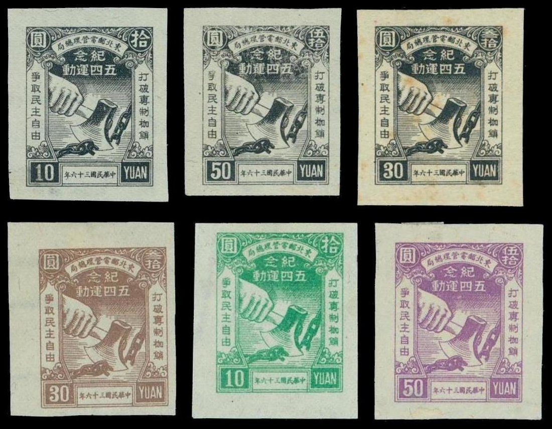 1947 (4 May) 28th Anniv. of Students' Movement in Peking University $10 to $50 set of three, master die proof in black and coloured die proof, both sets with fresh appearences. Yang NE30P-NE32P. Photo