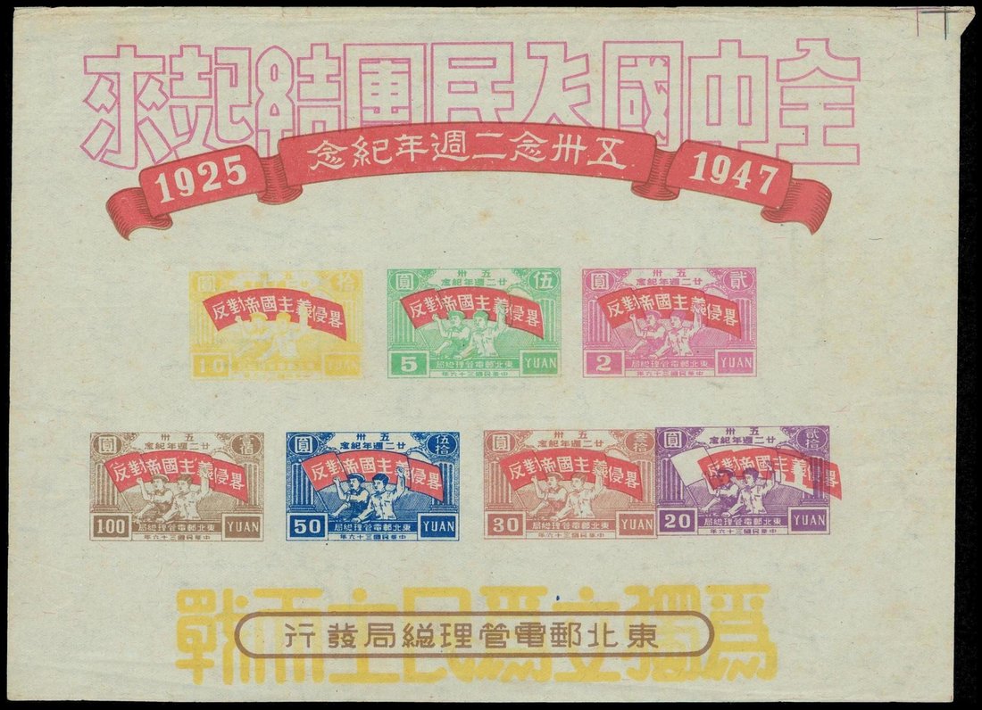 1947 22nd Anniv. of Nanking Road Incident miniature sheet, longer than normal showing crop mark at upper right, the $20 basic design misplaced to left and kissing the $30; and the red propaganda slogan also misplaced, fine unused. Yang NE59M var. Photo