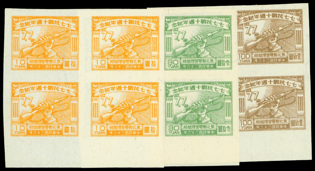 1947 The 10th Anniv outbreak of War with Japan, imperf. set of three missing $50 grey-blue, in blocks of four, unused without gum as issued, very fine and rare. Yang NE64a, NE65a, NE67a. Photo
