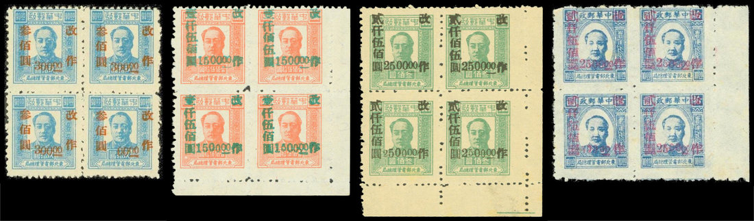 A small mint accumulation of Chairman Mao 3rd to 5th surcharged issues (25), most in blocks of four and all bearing surcharge varieties, comprising 3rd surch. $300 on $90 blue block of four with one stamp "3" missing in "300.00", 4th surch. $1,500 on $150 pale-red single with surch. inverted and block of four with character transposed, $2,500 on $300 blue-green blocks of four with character transposed and 5th surch. $2,500 on $10 blue block of four with one stamp "2" missing in "2500.00", an interesting assembly. Yang NE119d, NE126a, f, NE127b, c, NE130a. Photo