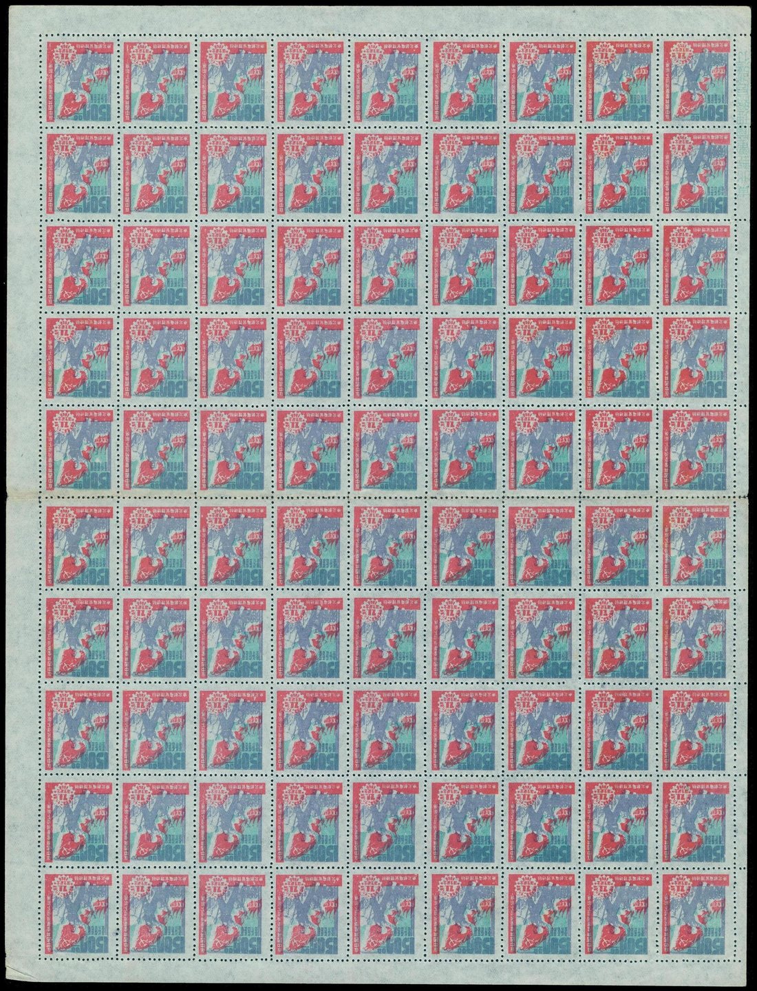 1949 Communist Party Anniv. $1500 red, grey-purple and blue in complete sheet of ninety with margins all round, the basic design lightly shifted to left, very fine unused. Yang NE148var. Photo