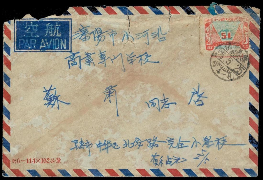 1949 (25 May) airmail envelope (with original enclosure) to Shenyang (27.5), bearing International Labour Day $1500, cancelled by "Changchun" c.d.s., fine. Photo