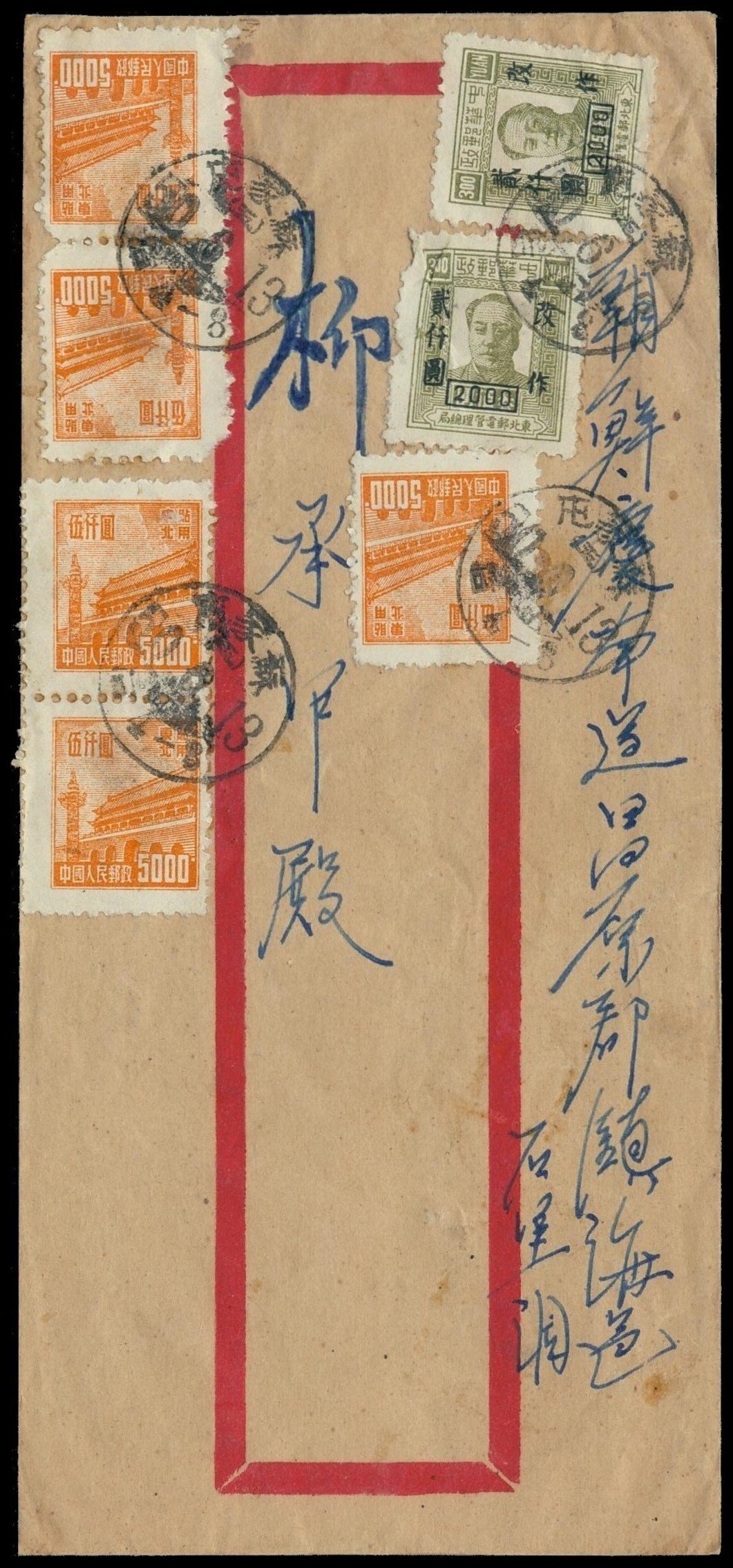 (x) 1950 (13 Jun.) envelope to Korea bearing 6th surch. on Chaiman Mao $2000 on $300 (2) and Tian An Men $5000 (5), cancelled by "Shenyang" c.d.s., fine. Photo