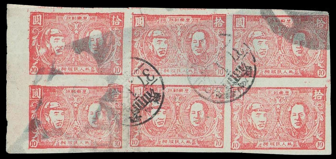 East Liaoning Post : 1947 Antung second printing Chu Teh and Chairman Mao $10 rose-red on coloured paper, in block of six, fine used by "Antung" c.d.s. Yang NE256. Photo