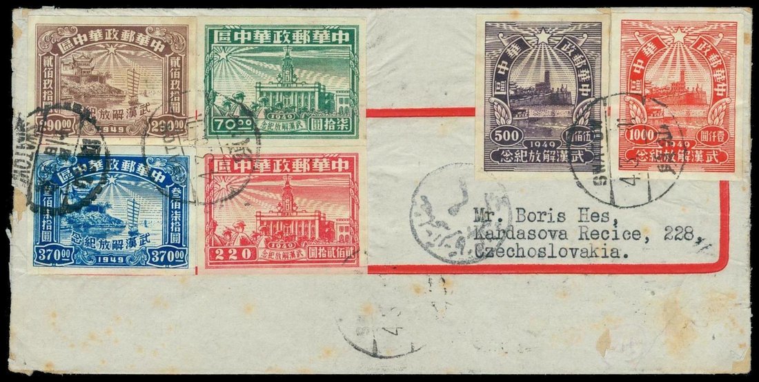 (x) 1949 Liberation of Hankow, Wuchang and Hangyang imper. set of six on 1950 (4 Mar.) envelope to Czechoslovakia (9.4) via Hong Kong and (8.3) and Egypt, cancelled by "Swatow" bilingual c.d.s., fine. Photo