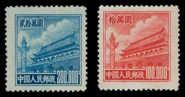 1951 Tien An Men 5th printing $10,000 to $200,000 (R5) set of six, unused without gum as issued, fine. Yang R30-R35. Photo