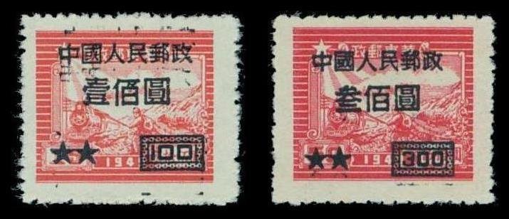 (x) 1950 Surcharged on East China Postal Transport issues $100 on $15 and $300 on $50, both showing surcharge doubling in different extent, fine unused. Yang SC41, SC42. Photo