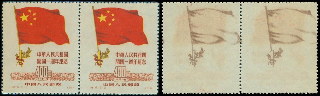 1950, First Anniversary of the People's Republic (C6) reprint $400 horizontal pair, variety the flag design printed on the reverse, pristine, exceptionally rare as only a half sheet of twenty-five with this variety (clearly not the common "offset" variety) is ever recorded. A stunning showpiece. Photo