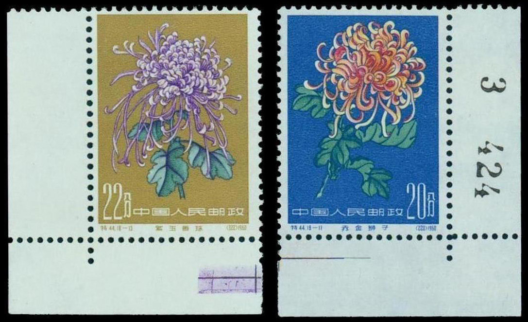 1960 Chrysanthemums (S44) 4f. to 52f. complete set of eighteen, each bearing corner margin at bottom left (20f. blue at bottom right with sheet number), fresh surface colours, fine to very fine unused. Yang S210-S227. Photo