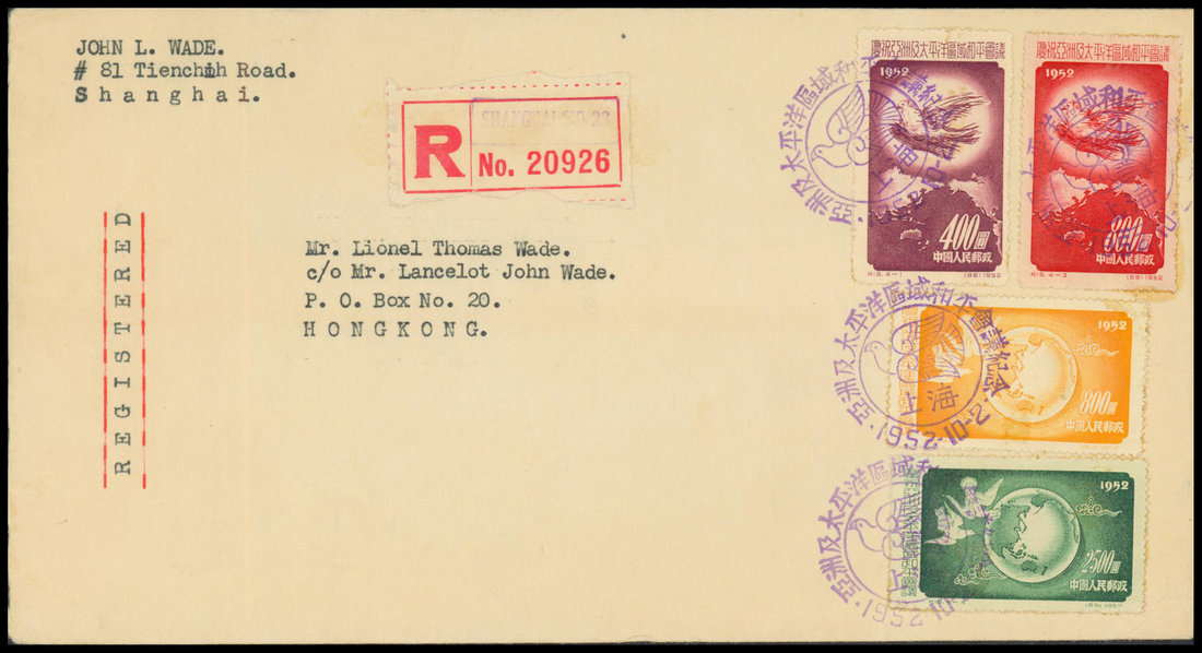 1952 (2 Oct.) registered first day cover to Hong Kong bearing Asian- Pacific Peace Conference (C18) set of four, cancelled by "Shanghai" native c.d.s., fine. Photo