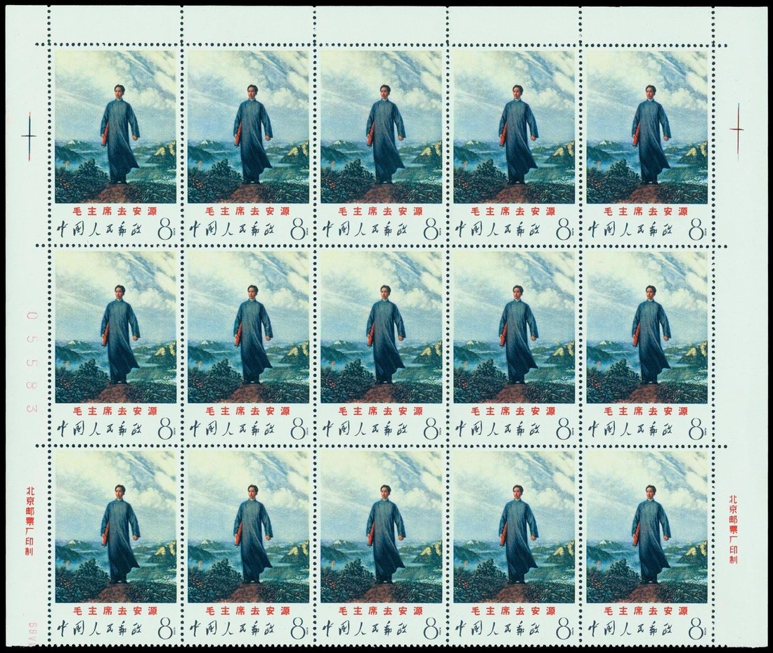 1968 Chairman Mao Goes to Anyuan (W12) 8f. block of fifteen from the top of the sheet with imprints and sheet number, unmounted mint, fine to very fine, a good large multiple of this popular stamp. Yang W61. Photo